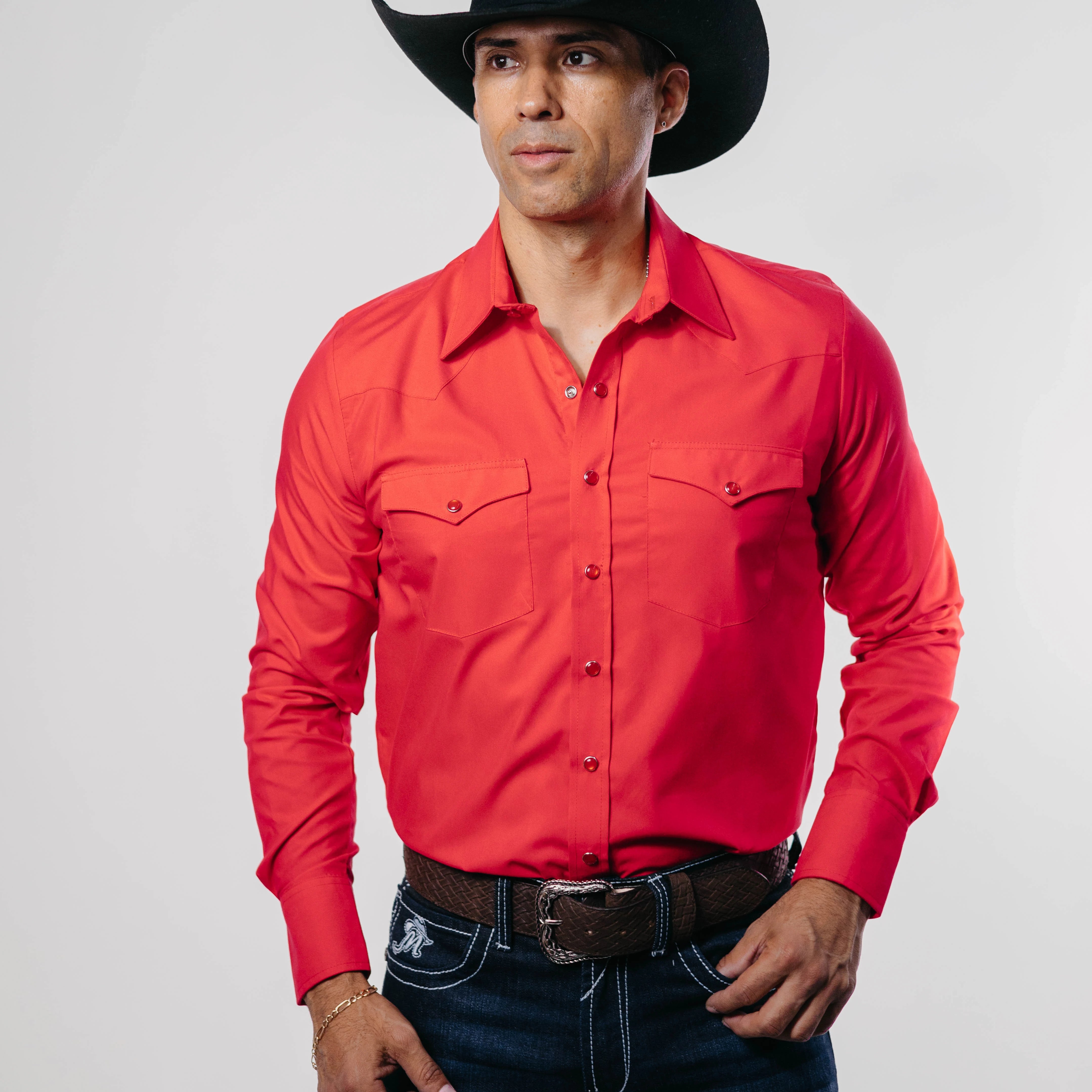 Camisa Vaquera Custer, Modelo Alaska, Lisa, Colo Roja, Manga Larga, Broches de presion, Corte Regular, Material 80% Poliester y 20% Algodón, SKU# CUS1002 *Nota: Modelo Mide 1.80, pecho 1.12 mts y uso talla M