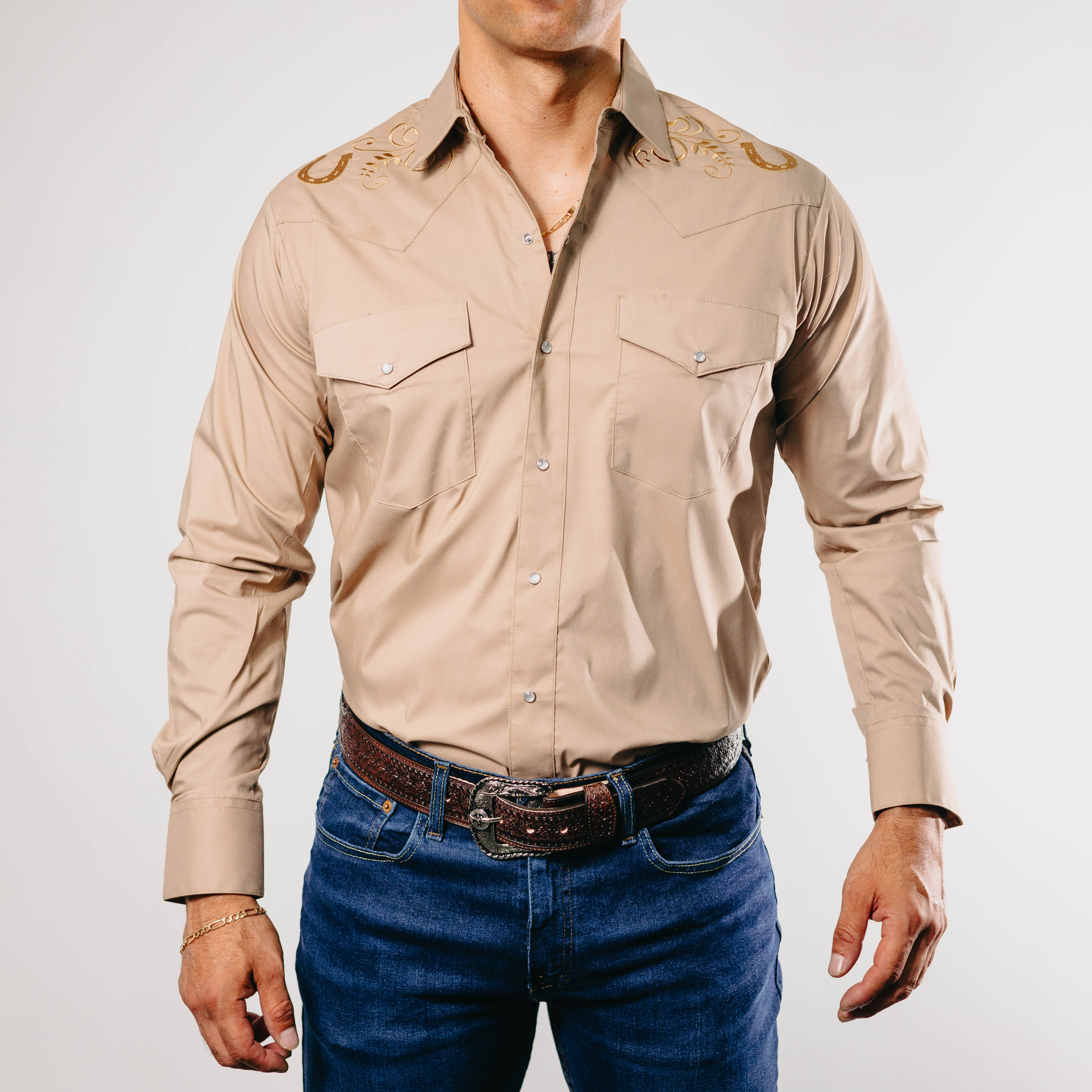 Camisa Hannover, Bordado, Herradura, Khaki, Manga Larga, Broches de presión, 65% Poliester, 35% Algodón, Corte Regular, SKU# HAN1311, *Nota: Las Camisas Hannover tienen corte amplio, le sugerimos revisar la tabla de medidas o llamarnos para cualquier duda, *Modelo Mide 1.80, pecho 1.12 mts y uso talla m