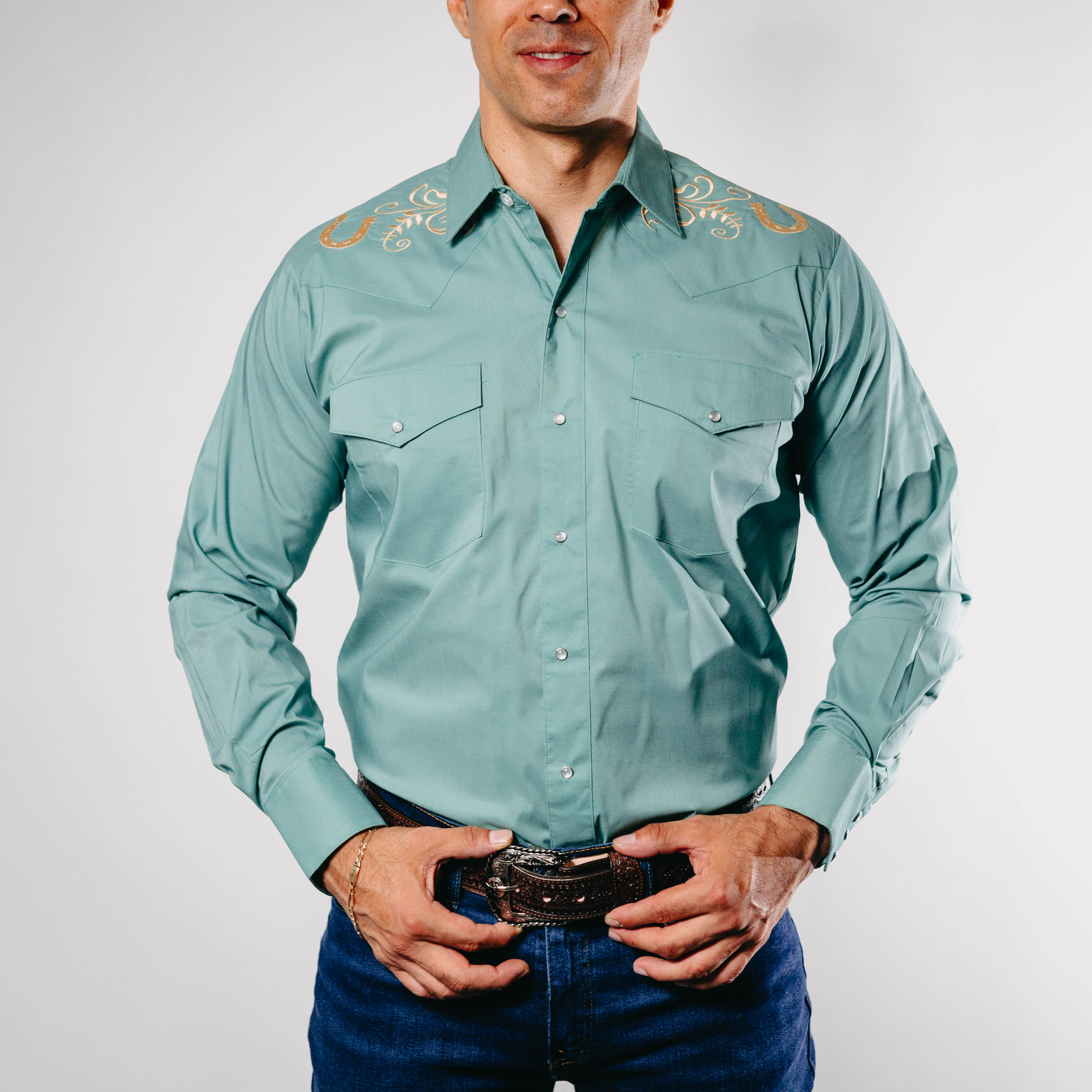 Camisa Hannover, Bordado, Herradura, Olivo, Manga Larga, Broches de presión, 65% Poliester, 35% Algodón, Corte Regular, SKU# HAN1312, *Nota: Las Camisas Hannover tienen corte amplio, le sugerimos revisar la tabla de medidas o llamarnos para cualquier duda, *Modelo Mide 1.80, pecho 1.12 mts y uso talla M