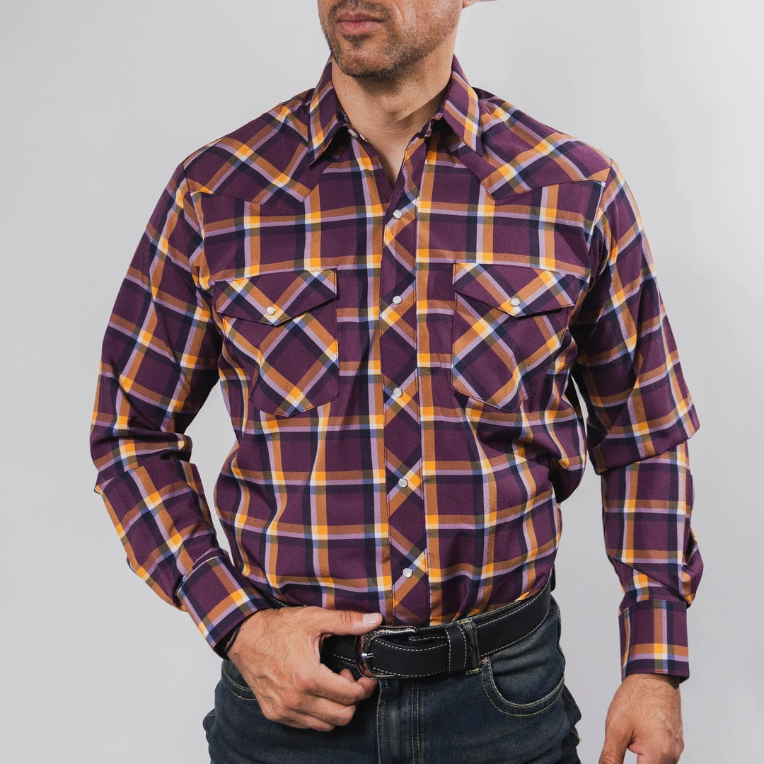 Camisa Vaquera Hannover, Cuadros, Color Morado/Naranja , Manga Larga, Broches de presión, Materiales 65% Poliester y 35% Algodón, Corte Regular, SKU# HAN1337, *La tonalidad puede variar según el lote *Nota: Las Camisas Hannover para caballero tienen corte amplio, le sugerimos revisar la tabla de medidas o llamarnos para cualquier duda, *Modelo Mide 1.80, pecho 1.12 mts y uso talla M