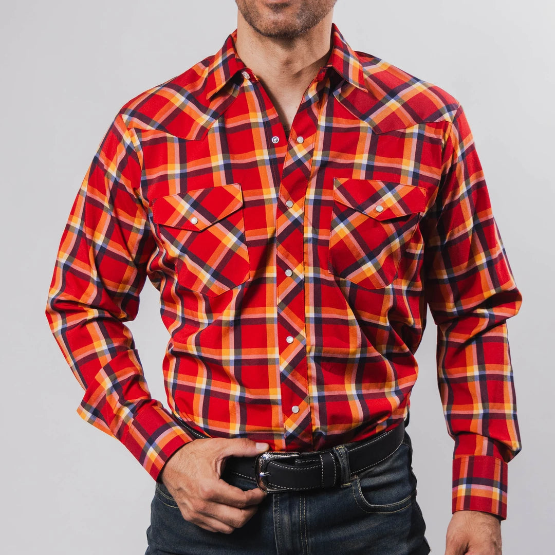 Camisa Vaquera Hannover, Cuadros, Color Rojo/Naranja/Negro, Manga Larga, Broches de presión, Materiales 65% Poliester y 35% Algodón, Corte Regular, SKU# HAN1335, *Nota: Las Camisas Hannover para caballero tienen corte amplio, le sugerimos revisar la tabla de medidas o llamarnos para cualquier duda, *Modelo Mide 1.80, pecho 1.12 mts y uso talla M
