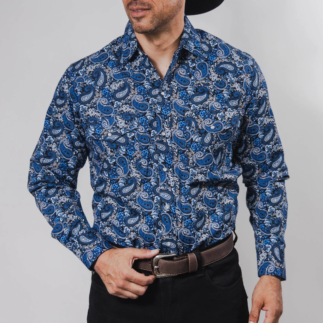 Camisa Vaquera Hannover, Estampado Amibas, Color Azul/Blanco, Manga Larga, Broches de presión, Materiales 100% Algodón, Corte Regular, SKU# HAN1367, *Nota: Las Camisas Hannover para caballero tienen corte amplio, le sugerimos revisar la tabla de medidas o llamarnos para cualquier duda, *Modelo Mide 1.80, pecho 1.12 mts y uso talla M