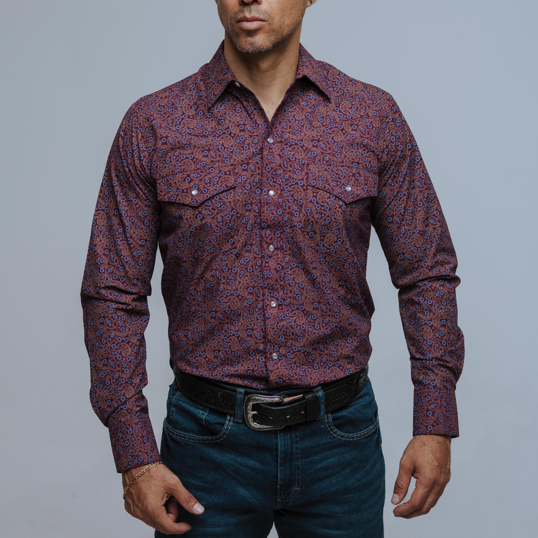 Camisa Hannover, Estampado, Vino, Amibas, Manga Larga, Broches de presión, 65% Poliester 35% Algodón, Corte Regular, SKU# HAN1278 *Modelo Mide 1.80 y usó talla M