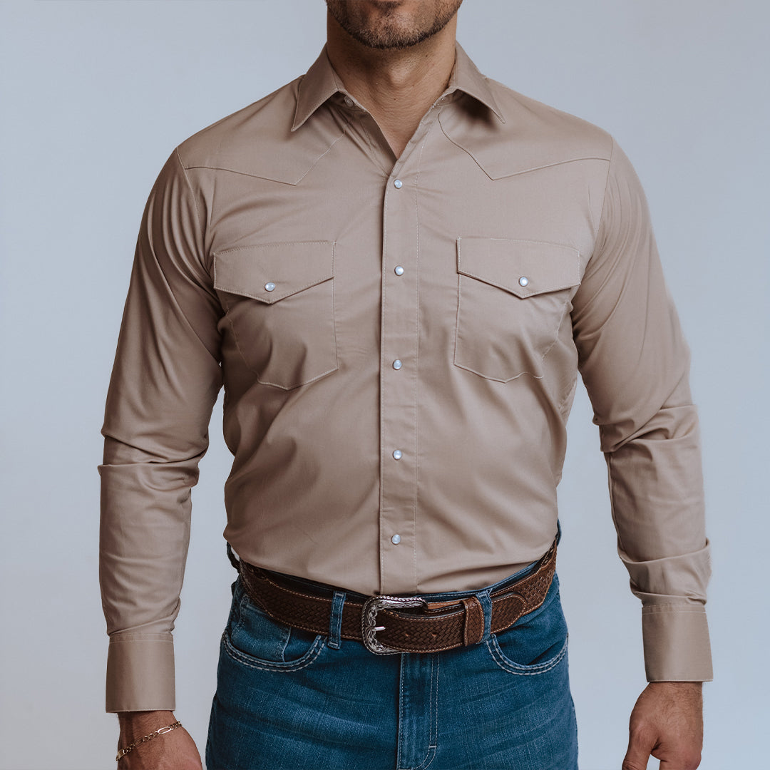Camisa Vaquera Hannover, Arena Liso, Manga Larga, Broches de presión, 65% Poliéster 35% Algodón, Corte Regular, SKU# HAN1141, *Modelo Mide 1.80, Pecho 102cm y uso talla S
