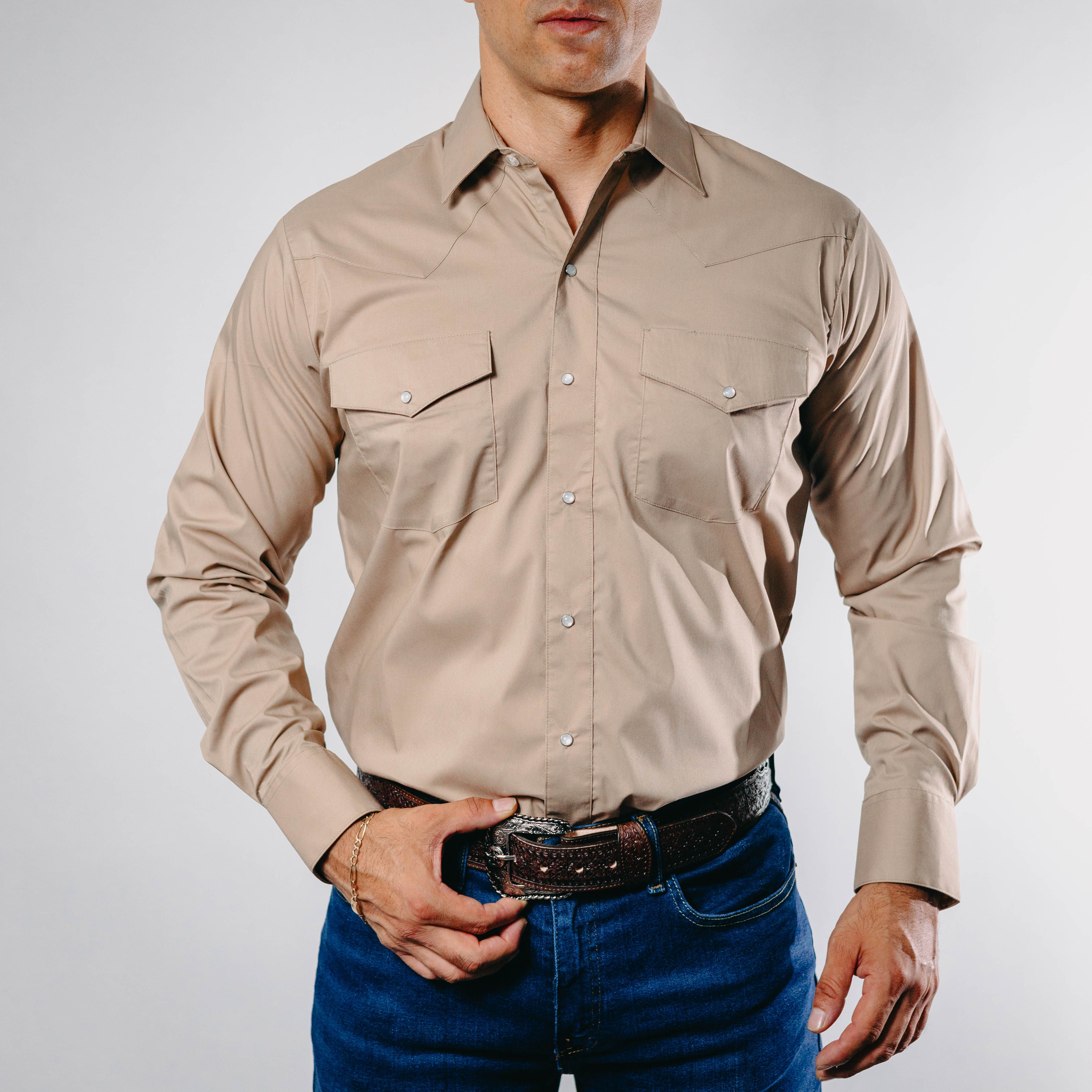 Camisa Hannover, Lisa, Khaki, Manga Larga, Broches de presión, 65% Poliester, 35% Algodón, Corte Regular, SKU# HAN1283, *Nota: Las Camisas Hannover tienen corte amplio, le sugerimos revisar la tabla de medidas o llamarnos para cualquier duda, *Modelo Mide 1.80, pecho 1.12 mts y uso talla M