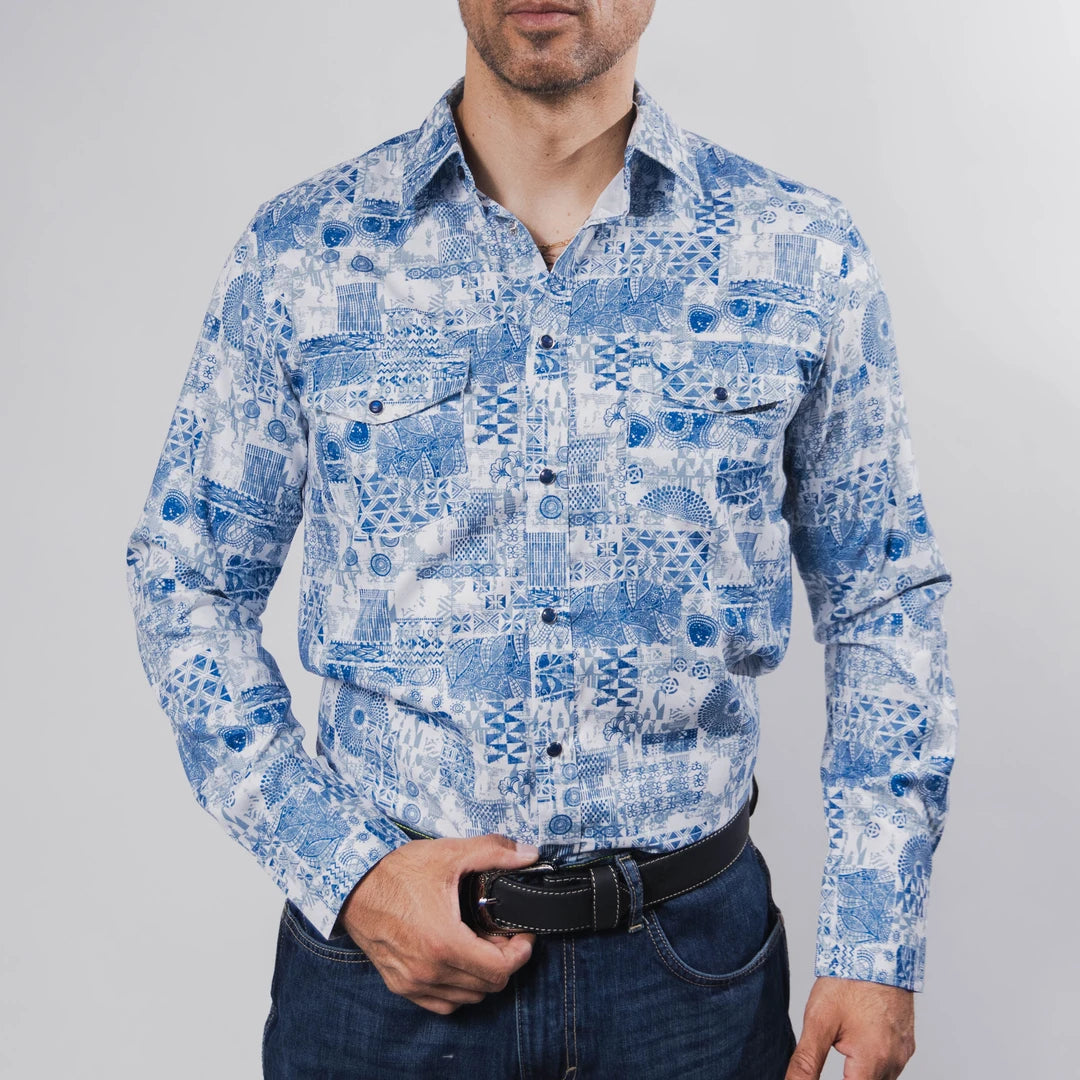 Camisa Vaquera McAllen, Estampado Atlanta, Color Blanco/Azul, Material 100% Poliester, Corte Regular, Broches de presión, SKU# MC21061, *Modelo Mide 1.80, pecho 1.12 mts y uso talla M