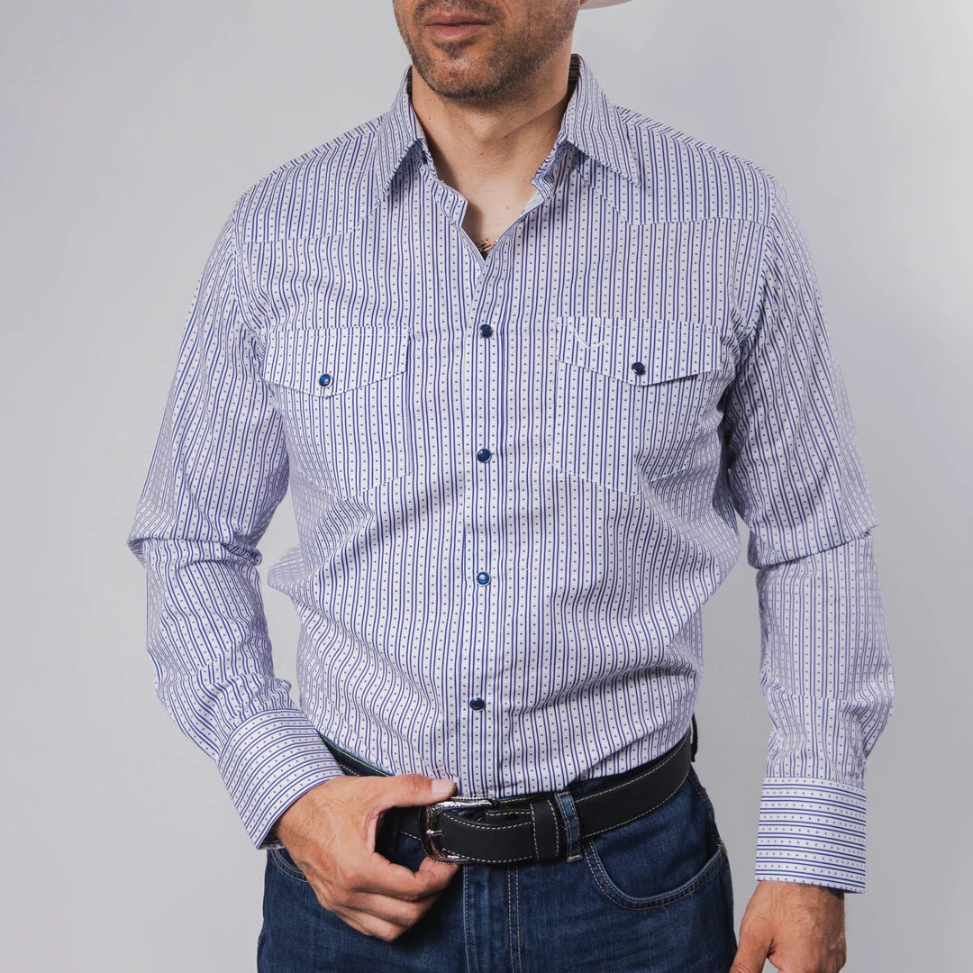 Camisa Vaquera McAllen, Estampado, Color Blanco/Azul, Stretch, Material 97% Algodón y 3% Spandex, Corte Regular, Broches de...