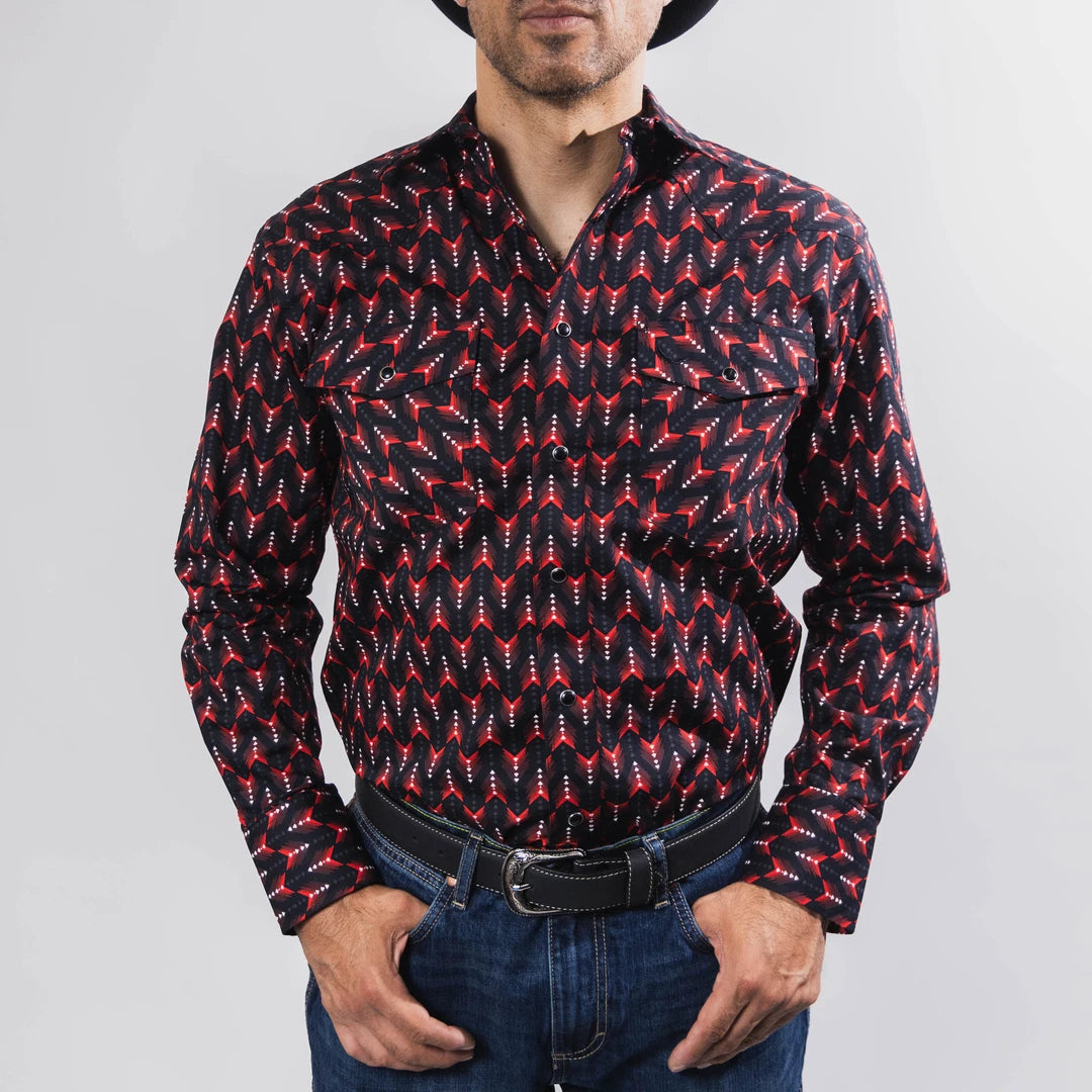 Camisa Vaquera McAllen, Estampado Flechas, Color Negro/Rojo, Material 100% Algodón, Corte Regular, Broches de presión, SKU# MC21052, *Modelo Mide 1.80, pecho 1.12 mts y uso talla M