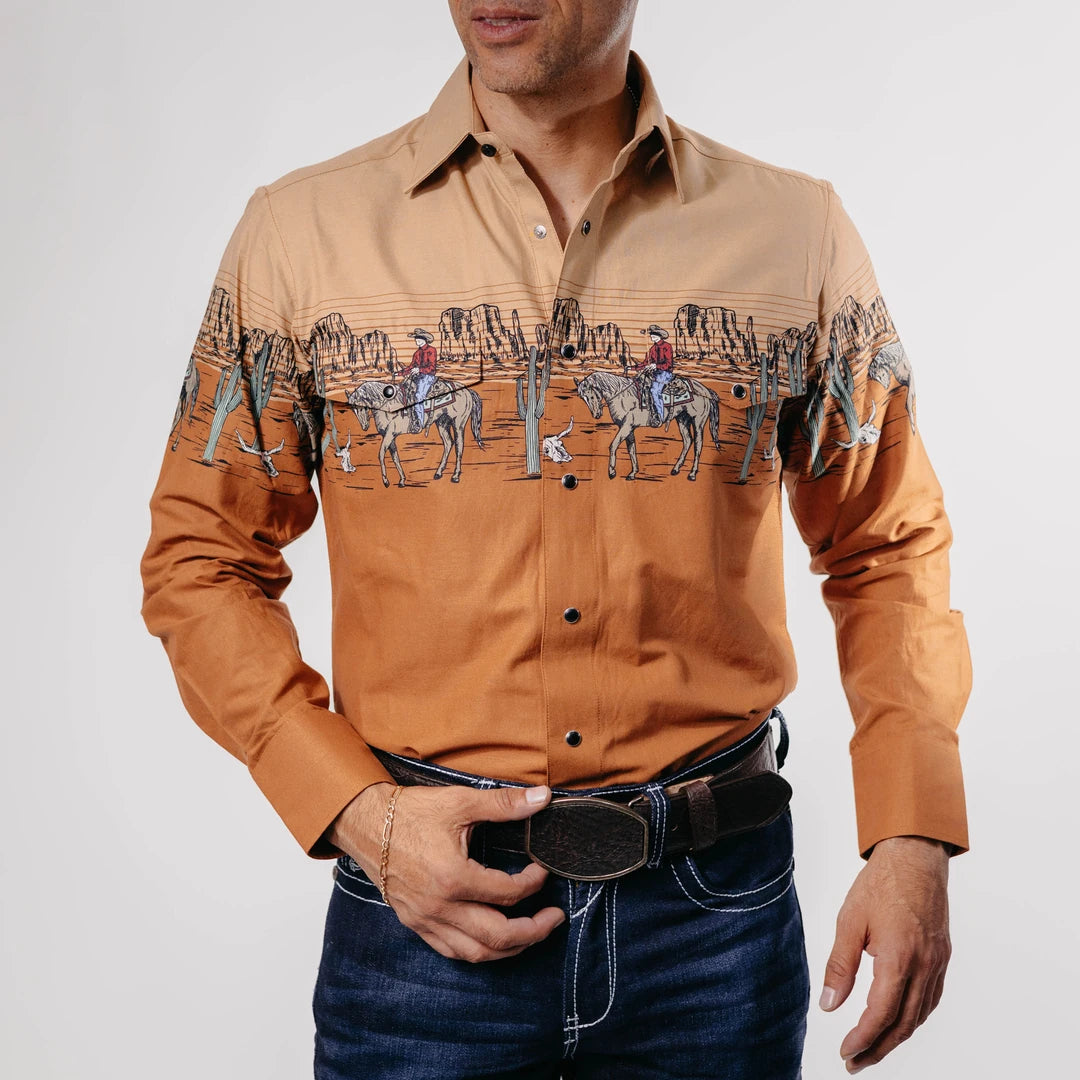 Camisa Vaquera Panhandle, Color Khaki, Estampado Retro Rider Border, Broches de presiòn, Bolsas con broches en el...