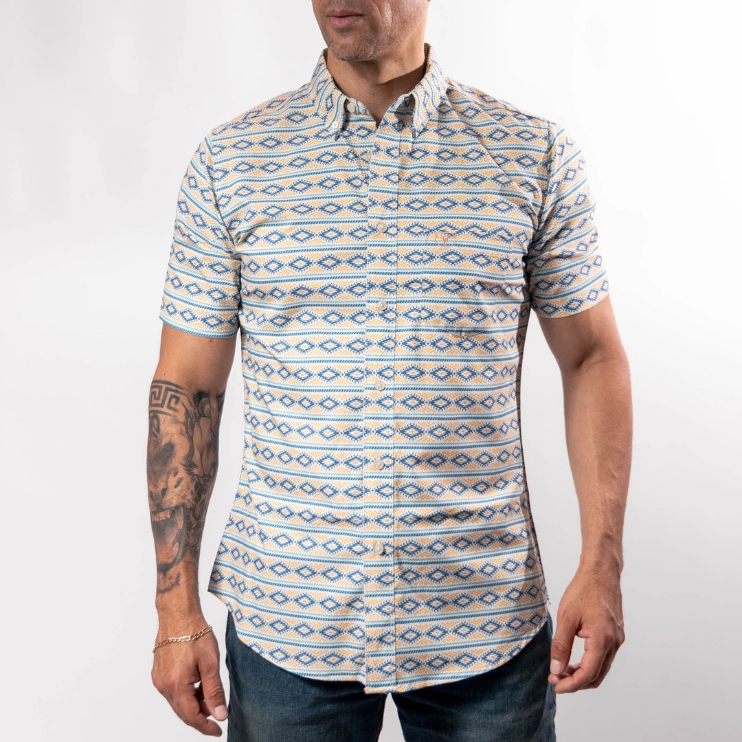 Camisa Vaquera Platini, Estilo Pescador, Estampado Color Blanco/Azul, Performance Ligera y Transpirable, Control de Olores, Absorcion y Sistema de Ventilacion Trasera, Secado Rapido, Detalle en Aletilla interior parte baja para limpiar sus lentes, Botones, Manga Corta, Stretch, Material 88% Poliester y 12% Spandex, Corte Classic Fit, SKU# PLA1050 *Modelo Mide 1.80, pecho 1.12 mts y usó talla M