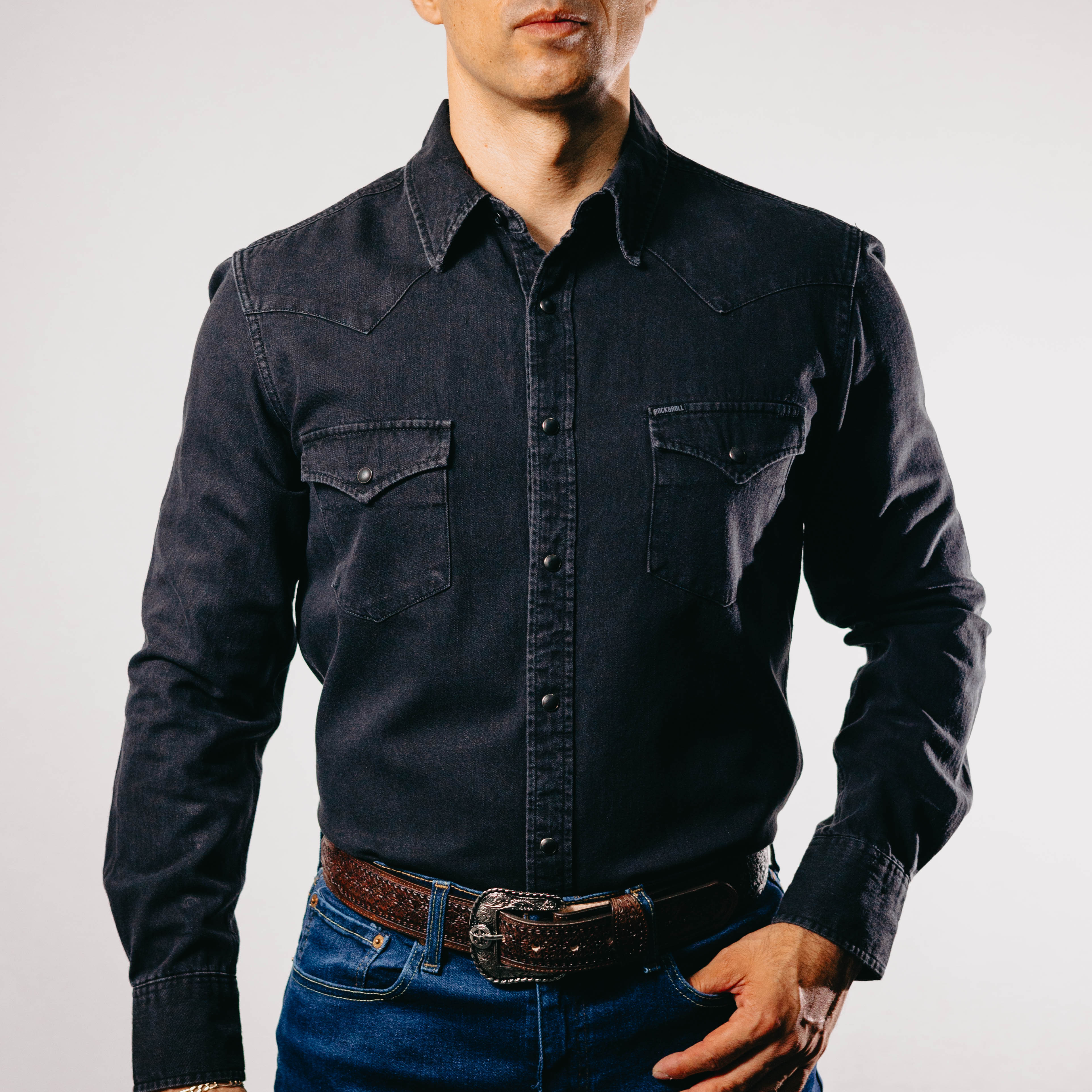 Camisa Vaquera Rock&Roll, Black, Denim, Manga Larga, Broches de presón, Corte Regular, 100% Algodón, SKU# ROC1006, *Modelo Mide 1.80, pecho 1.12 mts y uso talla M