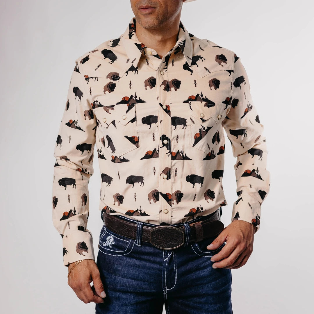 Camisa Vaquera Rock&Roll, Color Beige, Estampado Bufalo, Pana, Broches de presiòn, Bolsas con broches en el pecho, Material 97% Cotton y 3% Spandex, SKU# ROC1040, *Modelo Mide 1.80, pecho 1.12 mts y uso talla M