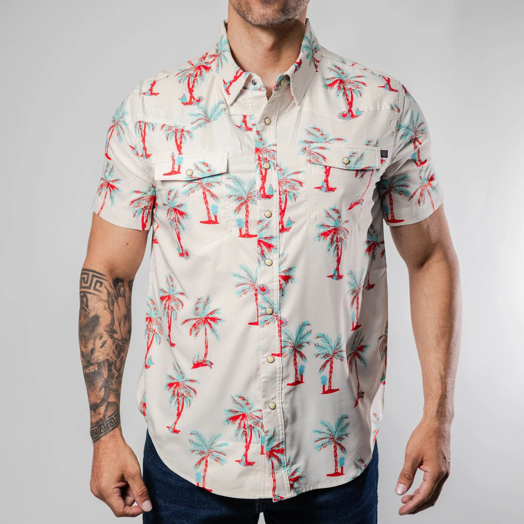 Camisa Vaquera Rock&Roll, Color Beige, Estampado Palmas, Tek, Performance Ligera y Transpirable, Control de Olores, Absorcion y Sistema de Ventilacion en Espalda, Broches de presión, Bolsas con broches en el pecho, Strech, Manga Corta, Material 95% Poliester y 5% Spandex, SKU# ROC1060, *Modelo Mide 1.80, pecho 1.12 mts y uso talla M