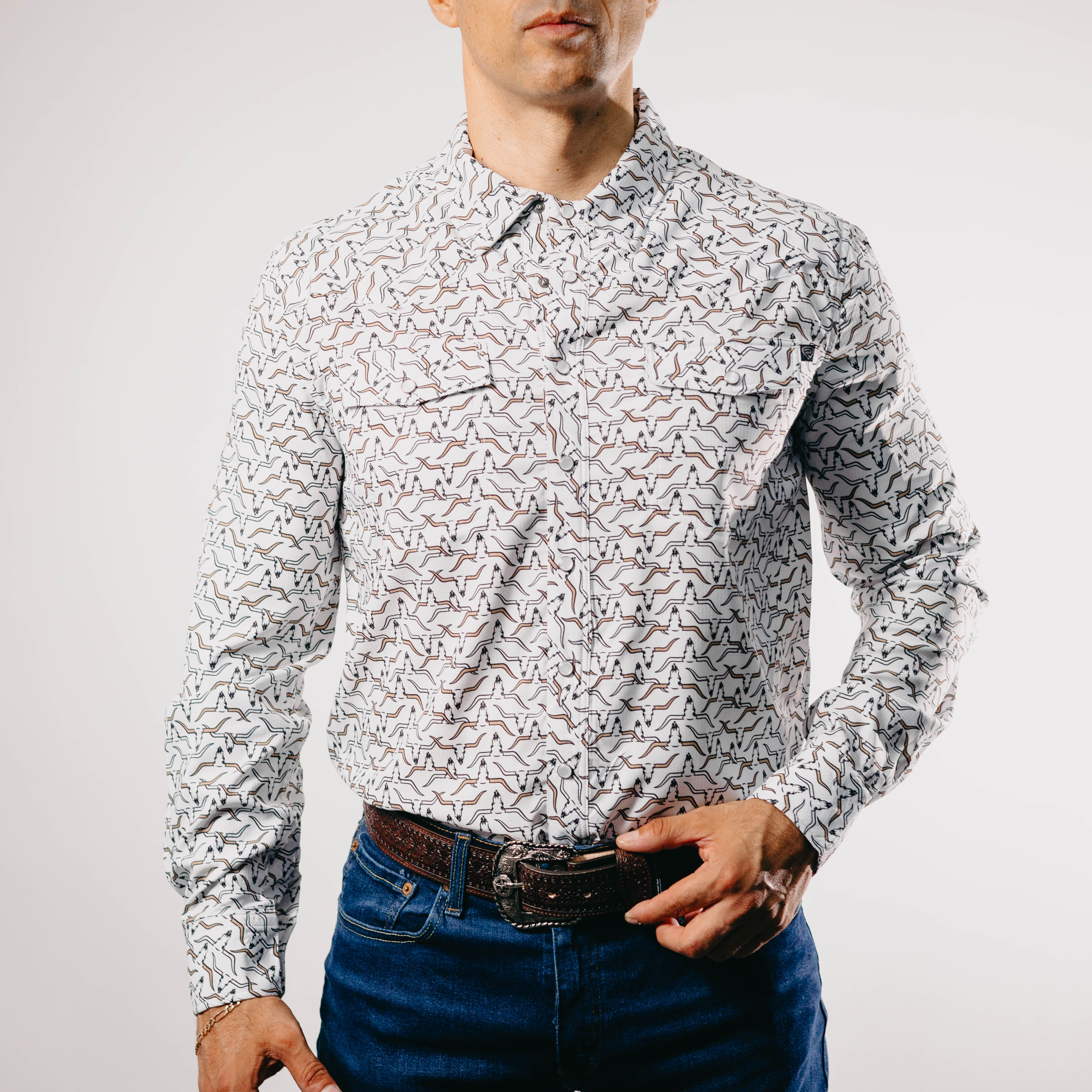 Camisa Vaquera Rock&Roll, Performance Ligera y Transpirable, Control de Olores, Absorcion y Sistema de Ventilacion Trasera, Longhorn, Blanca, Manga Larga, Broches de presón, Corte Regular, 100% Poliester, SKU# ROC1002, *Modelo Mide 1.80, pecho 1.12 mts y uso talla M