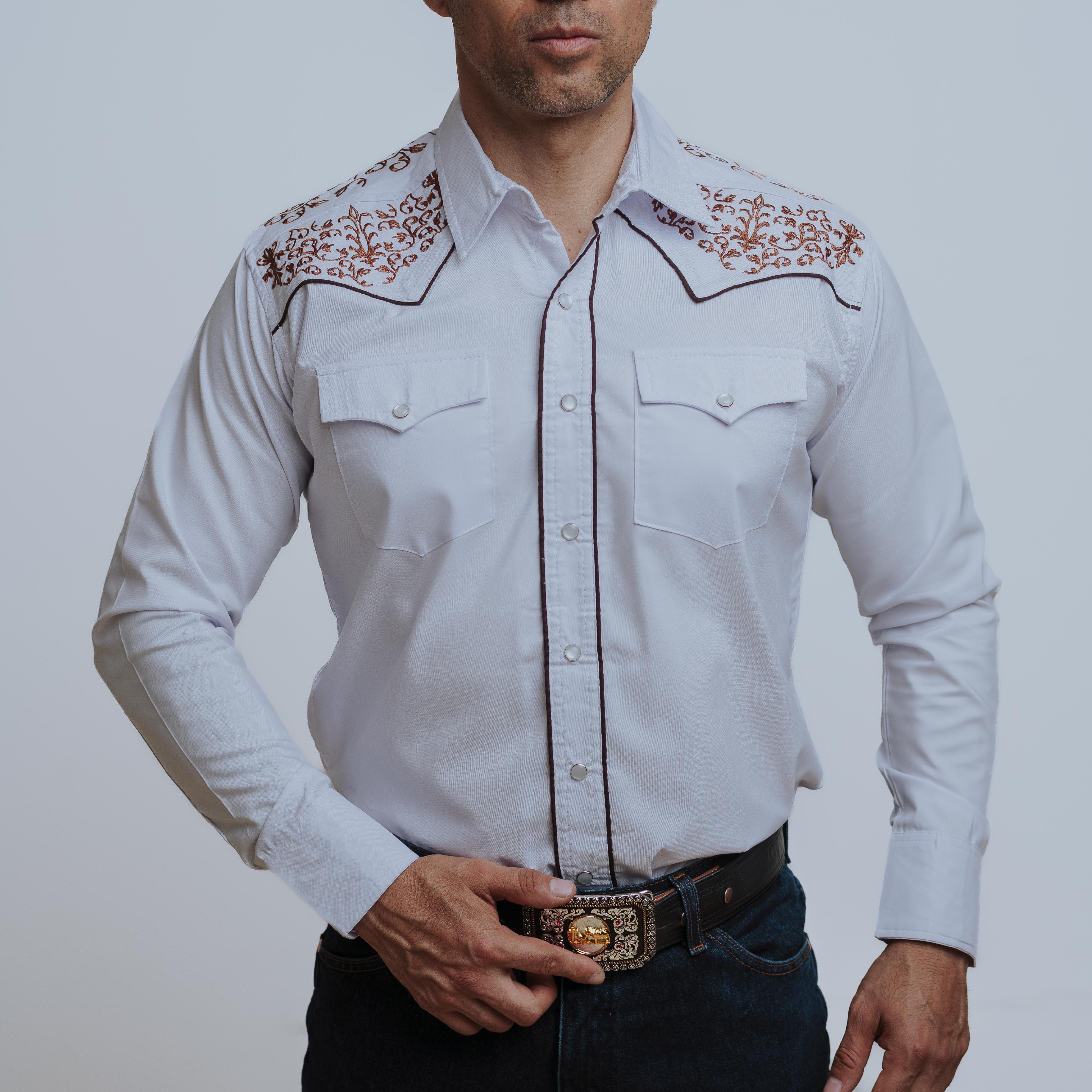 Camisa Wild Bull, Blanca Bordada Café, Manga Larga, Broches de presión, Corte Regular, 70% Poliester, 30% Algodón, SKU# CAL1067, *Modelo Mide 1.80, pecho 1.12 mts y uso talla M