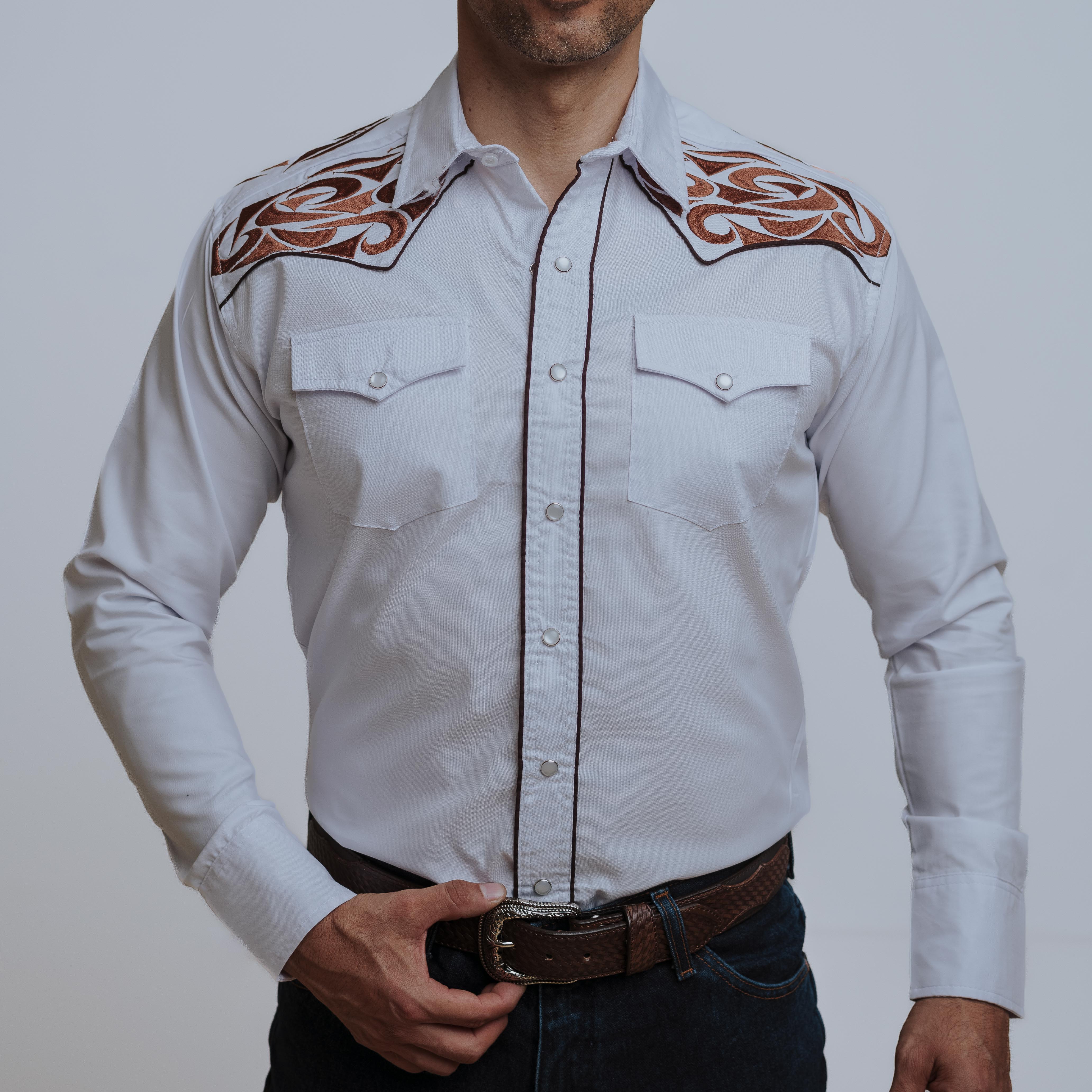 Camisa Wild Bull, Blanca Bordado Grande Café, Manga Larga, Broches de presión, Corte Regular, 70% Poliester, 30% Algodón, SKU# CAL1077, *Modelo Mide 1.80, pecho 1.12 mts y uso talla M
