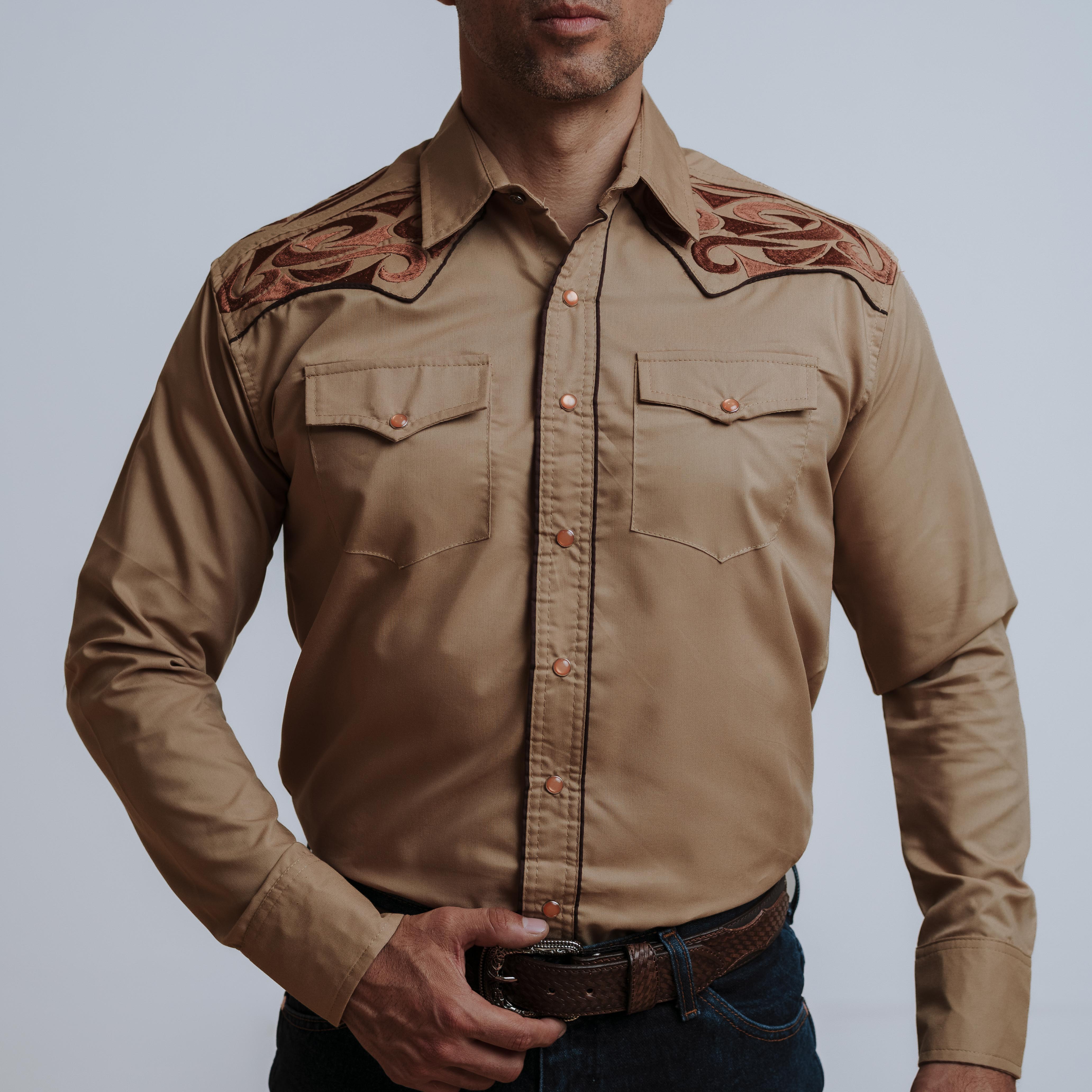 Camisa Wild Bull, Khaki Bordado Grande Café, Manga Larga, Broches de presión, Corte Regular, 70% Poliester, 30% Algodón, SKU# CAL1075, *Modelo Mide 1.80, pecho 1.12 mts y uso talla M
