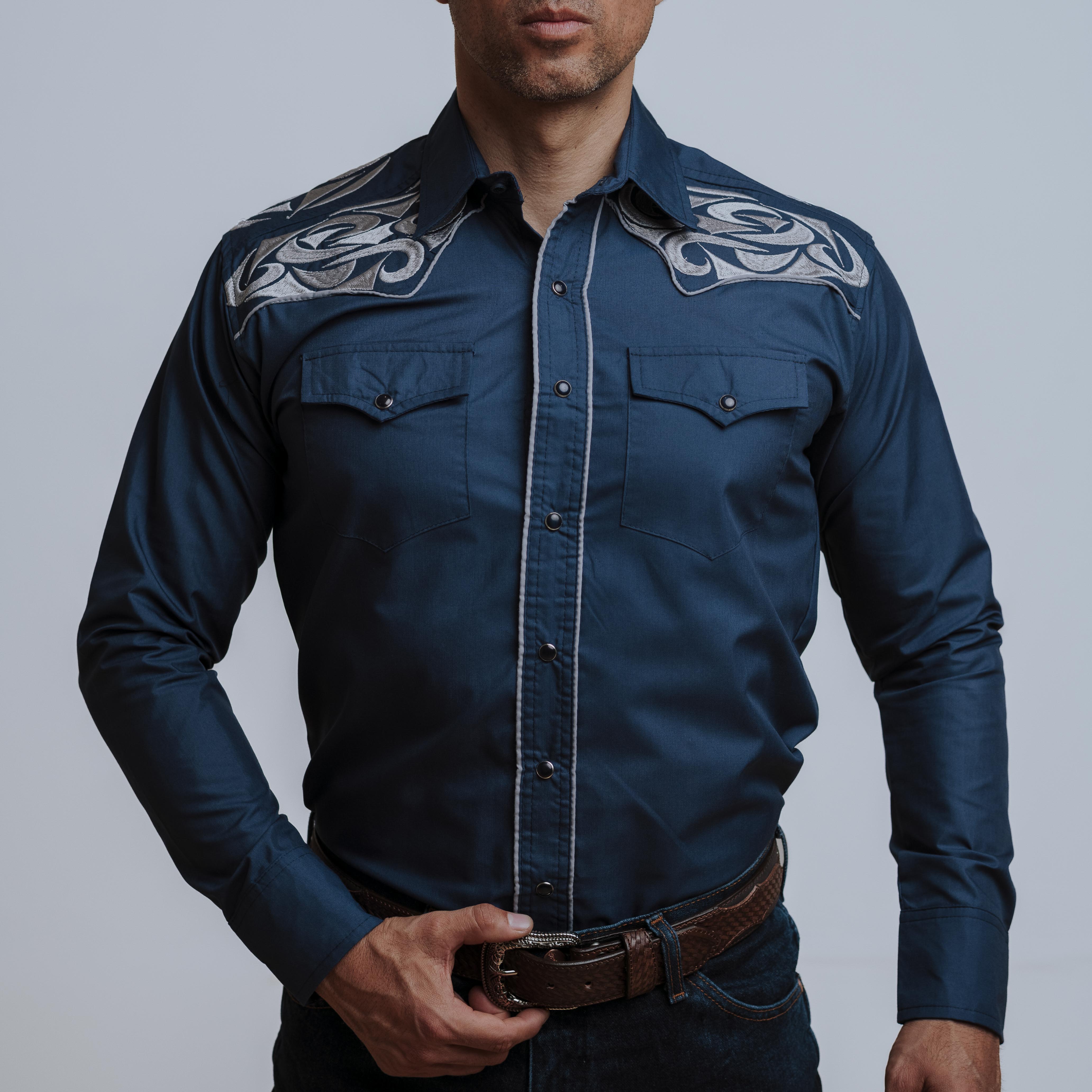 Camisa Wild Bull, Navy Bordado Grande Plateado, Manga Larga, Broches de presión, Corte Regular, 70% Poliester, 30% Algodón, SKU# CAL1076, *Modelo Mide 1.80, pecho 1.12 mts y uso talla M