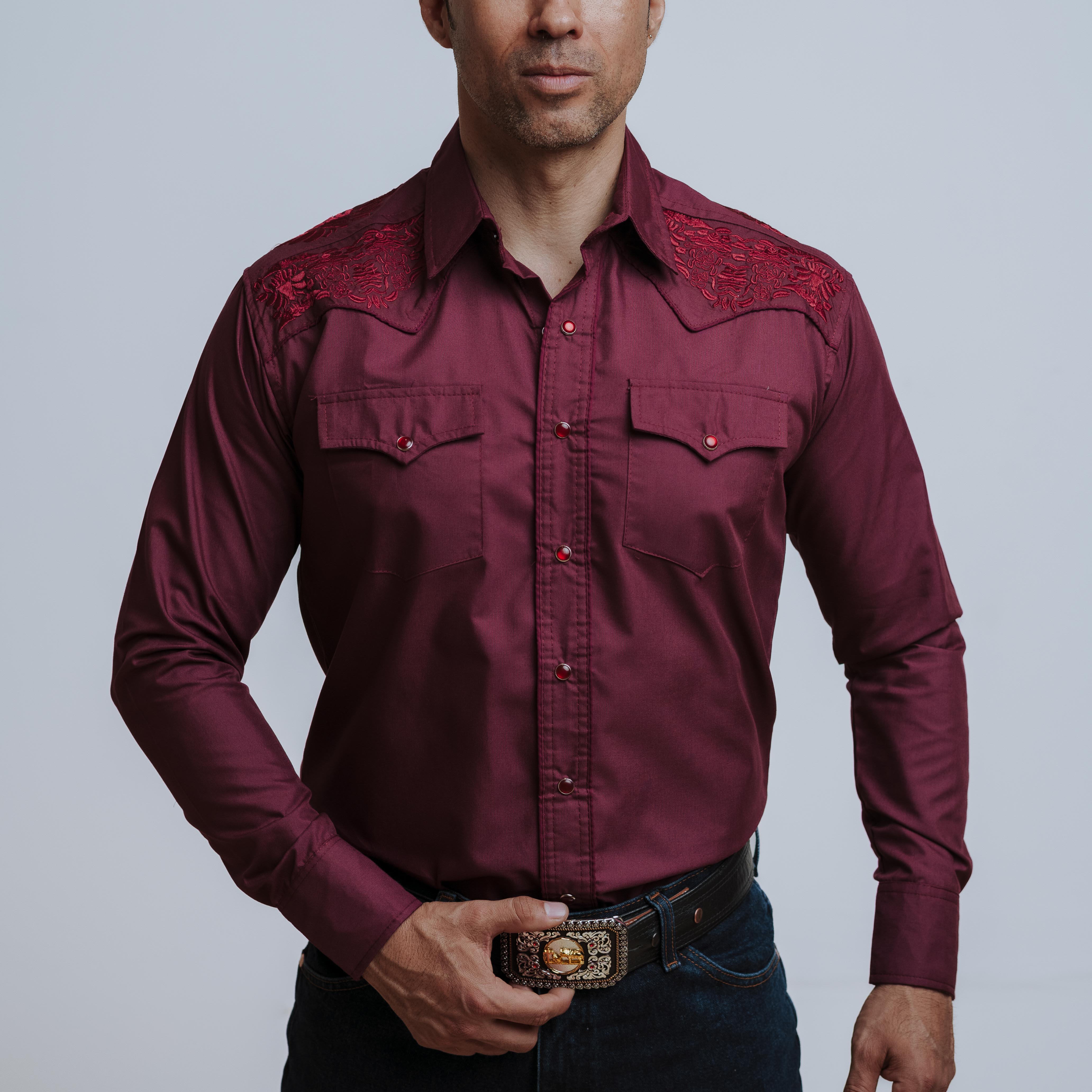 Camisa Wild Bull, Vino Bordada Vino, Manga Larga, Broches de presión, Corte Regular, 70% Poliester, 30% Algodón, SKU# CAL1070, *Modelo Mide 1.80, pecho 1.12 mts y uso talla M