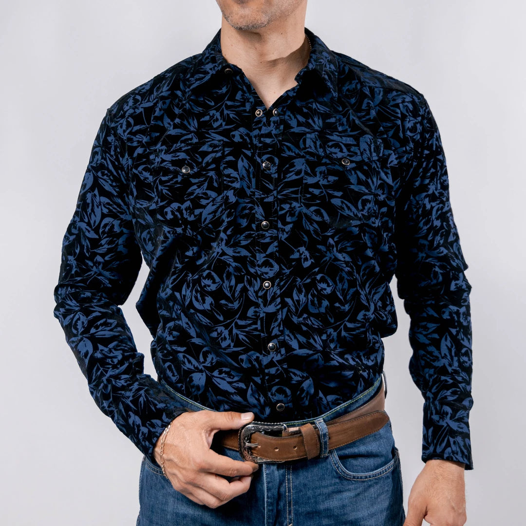 Camisa Wild Bull, Flock Estampado, Color Navy/Negro, Broches de presion, Material 100% Algodon, Corte Regular, SKU# CAL1081, *Modelo Mide 1.80, pecho 1.12 mts y usó talla M