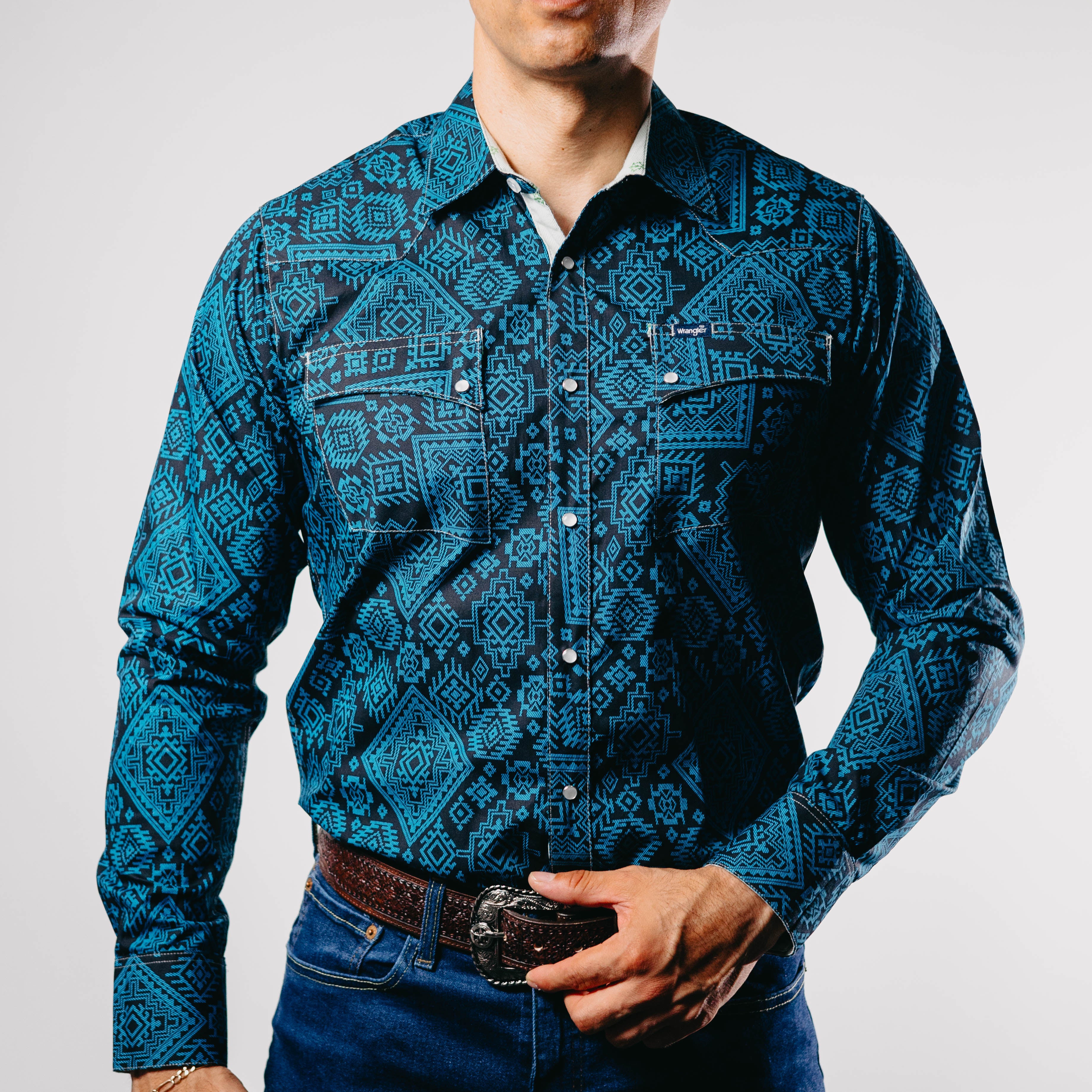 Camisa Vaquera Wrangler, Estampado Turquesa/Negro, Manga Larga, Broches de presión, Corte Regular, 100% Algodón, SKU# WR21209, *Modelo Mide 1.80, pecho 1.12 mts y uso talla M