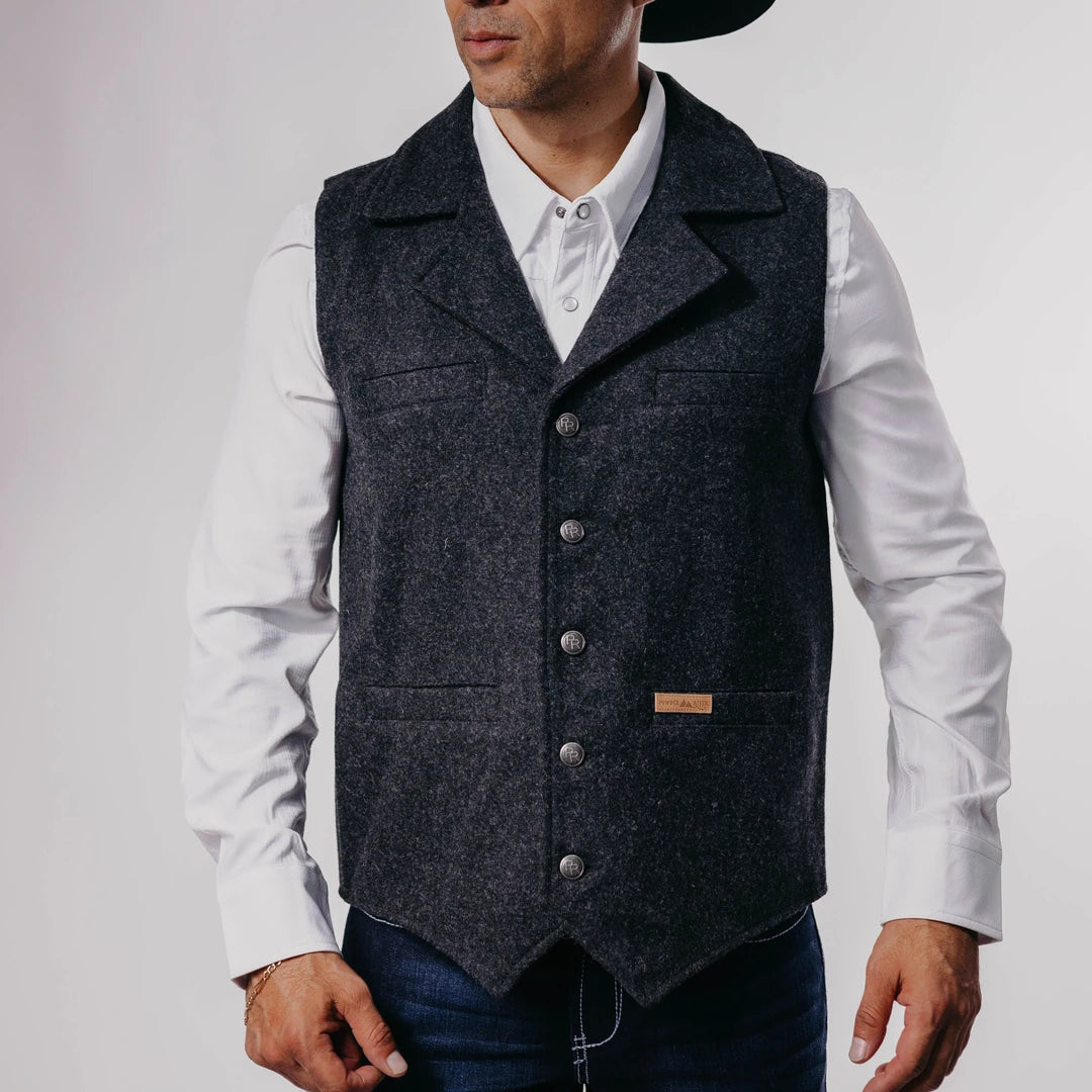 Chaleco Vaquero Panhandle, Color Negro, Lana, Montana, Broches de presion, Bolsas frontales, Material 80% Wool y 20% Poliéster, SKU# ROC1045, *Modelo Mide 1.80, pecho 1.12 mts y uso talla M