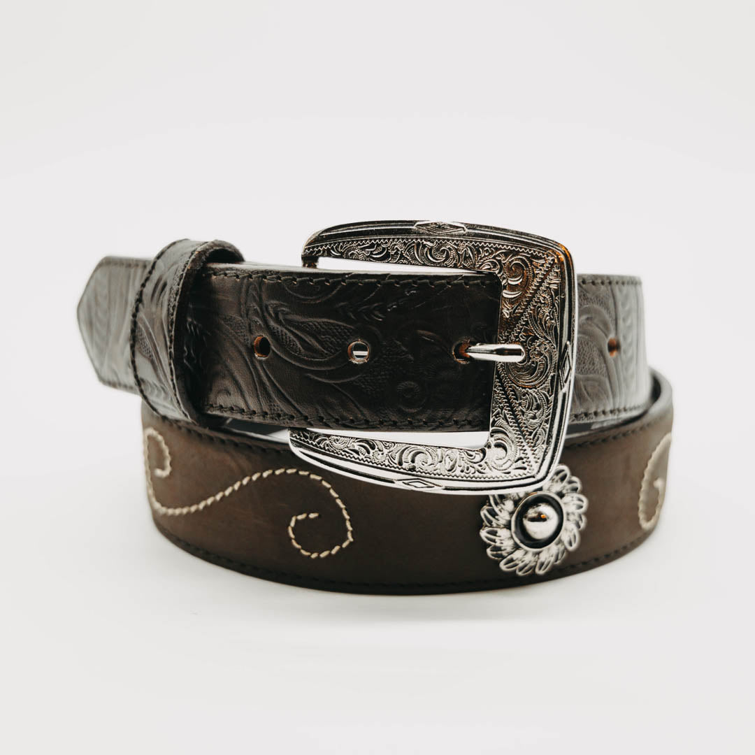 Cinto, Bulldogging, Café, Piel Vacuno, Bordado Hilo, Chapeton, 40 mm, (medidas aproximadas), Hebilla desmontable SKU# BDG1113