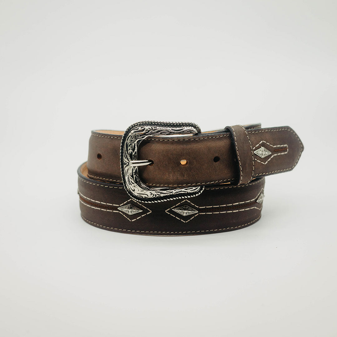 Cinto De Pura Sangre, Piel Vacuno, Forro Vacuno, Aplicación Chapetón Metálico Flechas Rombo, Café, 38 mm, Hebilla Metálica Desmontable.Debido a la naturaleza de la piel, el tono puede variar ligeramente.Café, SKU# DPS1031