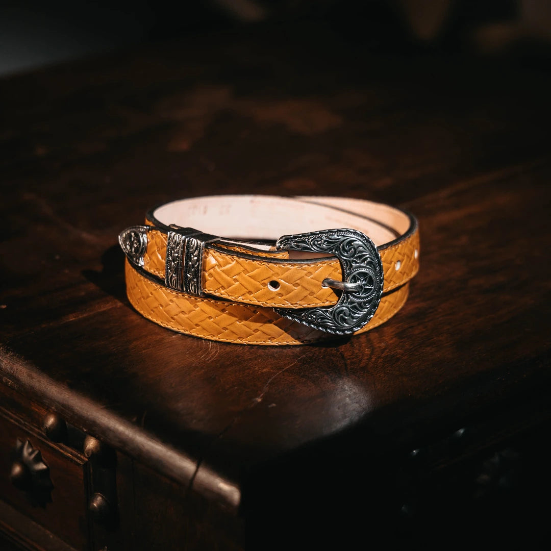 Cinto De Pura Sangre, Piel Vacuno, Forro Vacuno, Grabado Petatillo, Color Miel, Slim 25mm, Hebilla Metalica Desmontable con Puntera, SKU# DPS2014
