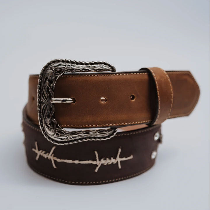Cinto De Pura Sangre, Aplicación Herrajes y Pedreria Remachada, Color Choco/Miel, Piel Vacuno, Forro de Res, 45mm, Hebilla Metalica Desmontable, SKU# DPS1048