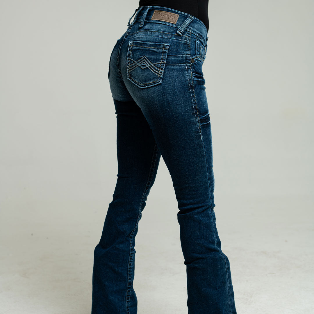 Pantalón Mezclilla KAJM, Corte Bota, Cintura Media, Stretch, 98% Algodón, 2% Spandex, Largo Aprox 32", SKU# KAJ2002 *Modelo mide 1.70 mts y uso Talla 5