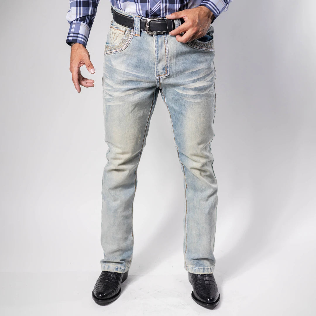 Pantalon Vaquero Platini, Color Celeste, Corte de bota, Botón y Cierre Con Cremallera Metálica al Frente, Bordados en Bolsillos y Aplicación de Vinipiel en color Blanco, Stretch, Material 68% Algodón, 30% Poliéster y 2% Spandex, SKU# PLA1201 *Nota: Modelo Mide 1.80 y usó talla 32X32