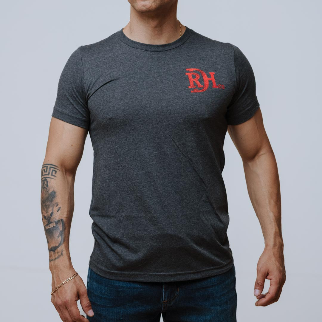 Playera Red Dirth, Freedom, DH, Grey, 52% Algodon, 48% Poliester, Corte Regular, SKU# RDH1001, *Modelo Mide 1.80, pecho 1.12 mts y uso talla M