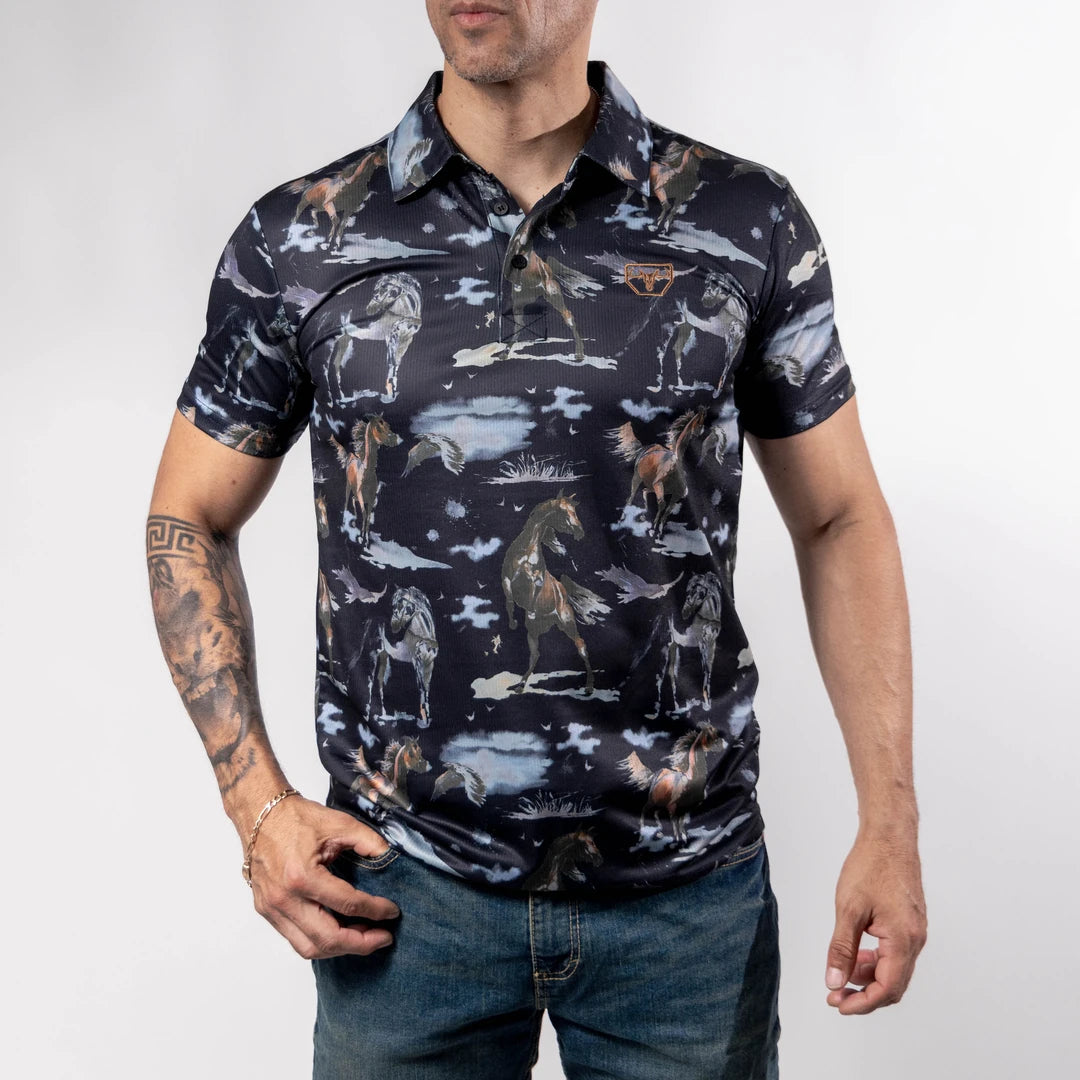 Playera Tipo Polo Platini, Color Negra, Estampado Horses, Ligera y Transpirable, Control de Olores y Absorcion, Botones, Manga Corta, Stretch, Material 100% Poliester, Corte Classic Fit, SKU# PLA1051 , *Modelo Mide 1.80, pecho 1.12 mts y usó talla M