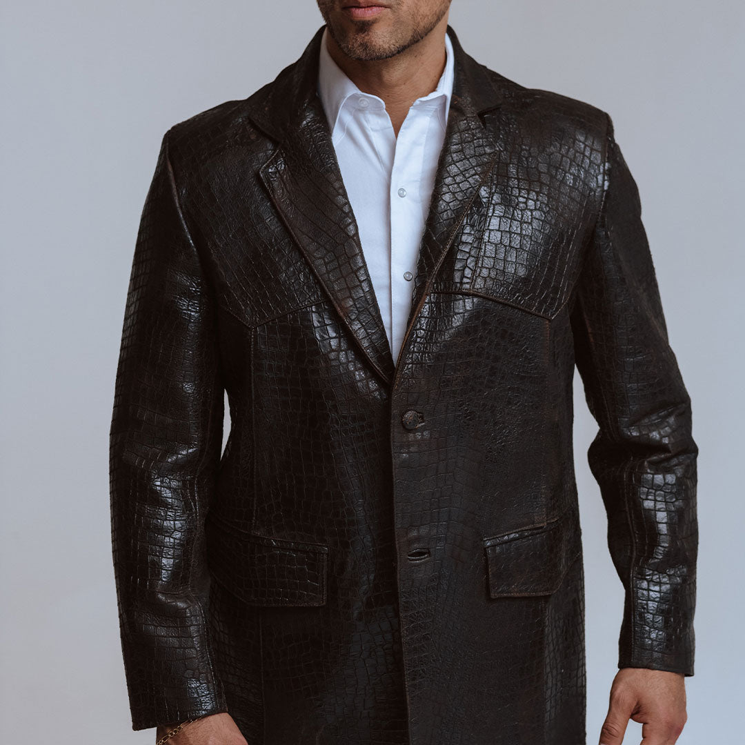 Saco Very Vaquero, Piel de Borrego Pelibuey, Grabado Cocodrilo Belly, Choco, Exterior Piel Pelibuey, Forro Poliéster, Corte...