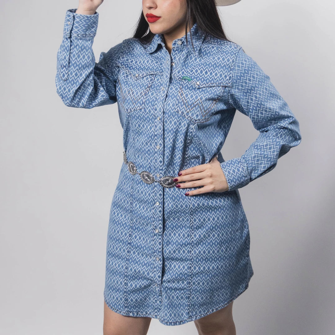 Vestido Vaquero Wrangler, Mezclilla, Checotah, Color Celeste, Broches de presión, Manga Larga, Stretch, Material 80% Algodón, 17% Poliester y 3% Elastano, SKU# WR22079, *Modelo Mide 1.56, pecho 92 cm y uso talla S, *Nota: No Incluye Cinturon